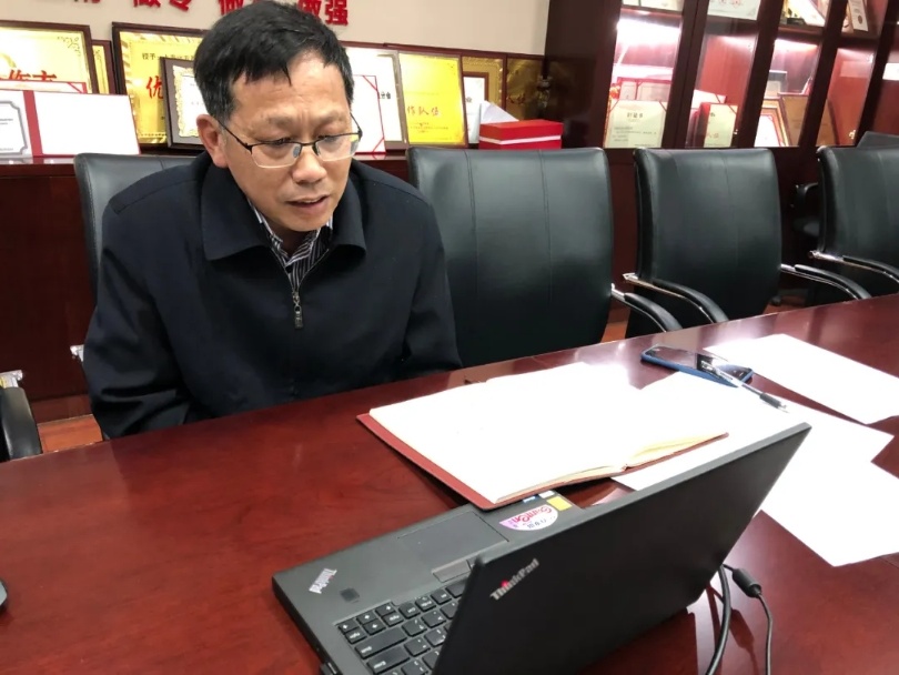 (劉忠池董事長(zhǎng)與異地管理人員視頻連線)
